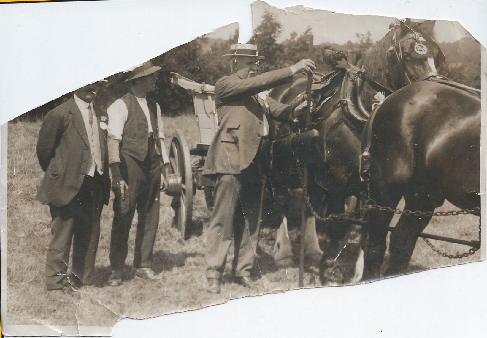 The back of the photo says "Robertsbridge - Judging the Hands - Mr A Elsam measuring the Hands of Competing Heavy Horses"