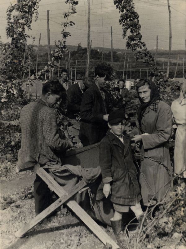Hand Picking at a bin in a hop garden at Northlands. The field is 'Dirty Hole'.