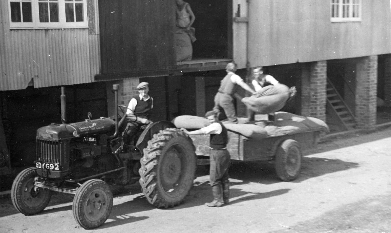 This photo shows the hop pokes being loaded on to the trailer ready for transporting to the oast.