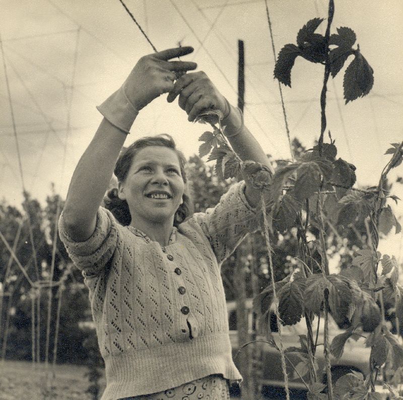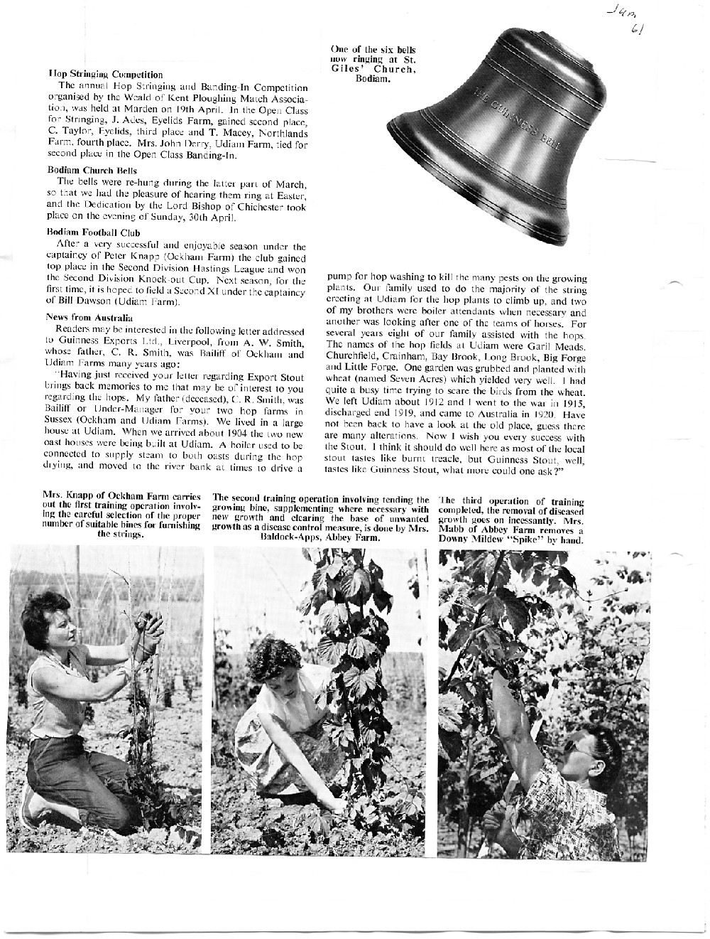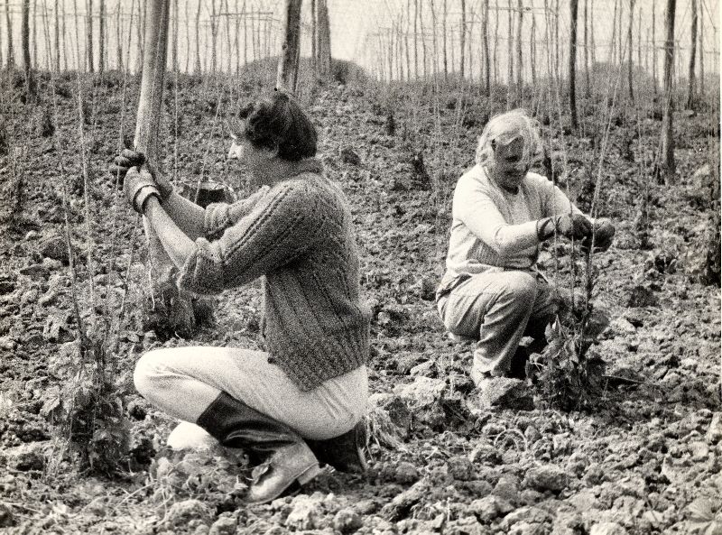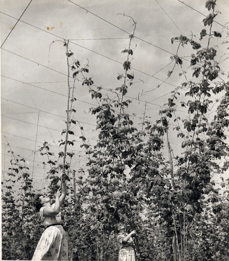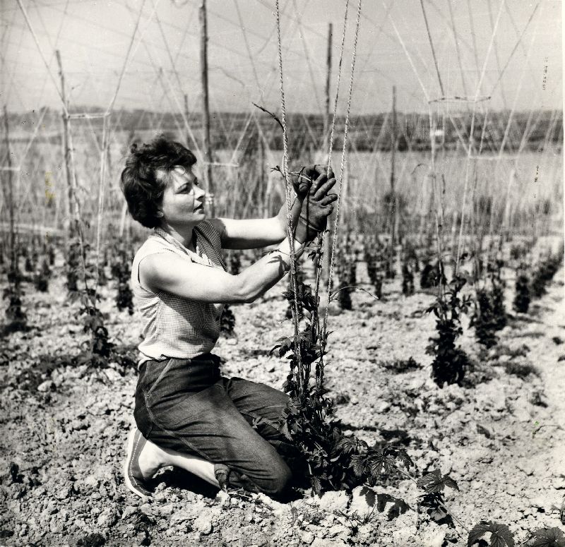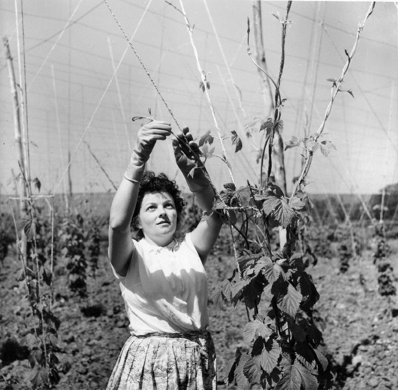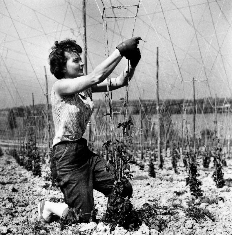 "The second training operation involving tending the growing bine, supplementing where necessary with new growth and clearing the base of unwanted growth as a disease control measure, is done by Mrs Baldock-Apps, Abbey Farm" |