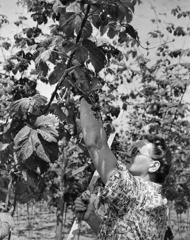 "Mrs Knapp of Ockham Farm carries out the first training operation involving the careful selection of the proper number of suitable bines for furnishing the strings" |