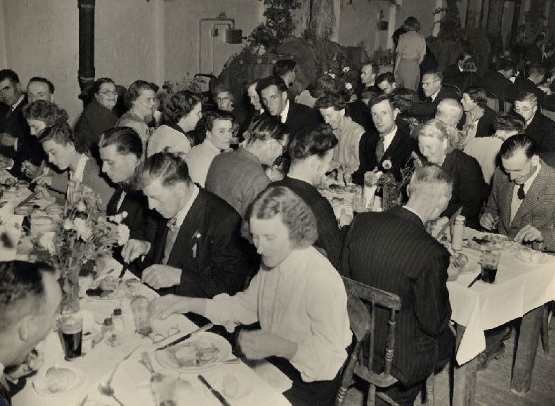Centre table, backs to camera left to right: Mrs Baitup, Phil Baitup, Hazel Baitup, June Baitup, Bill Russell, ?, ?.